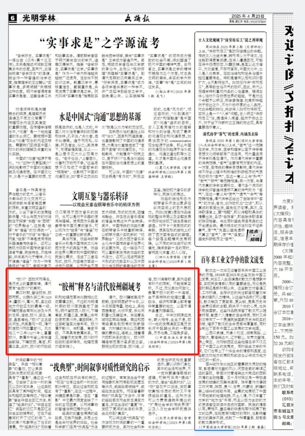 4月23日,由光明日报社主办的《文摘报》,在第六版“光明学林”栏目对《william威廉中文官网学报(社会科学版)》刊载论文《“胶州”释名与清代胶州疆域考》进行摘录转载。