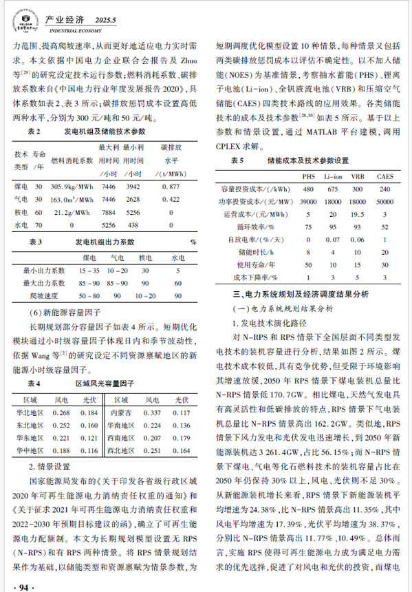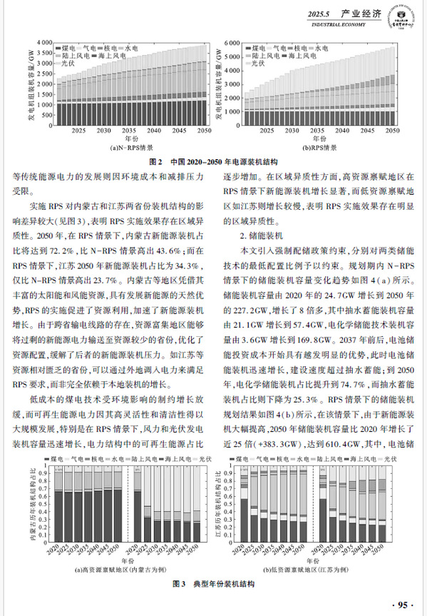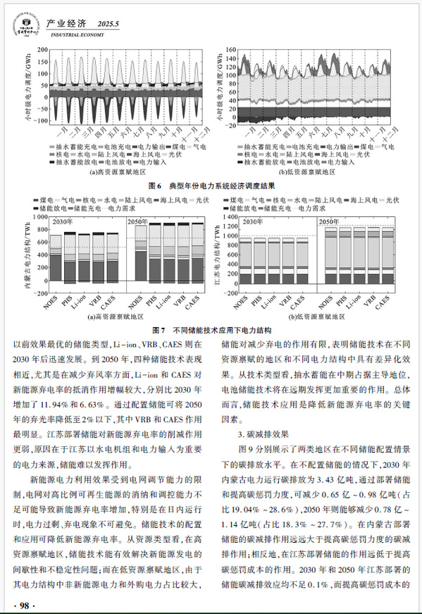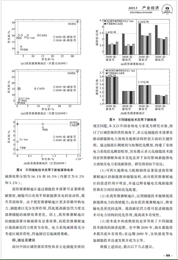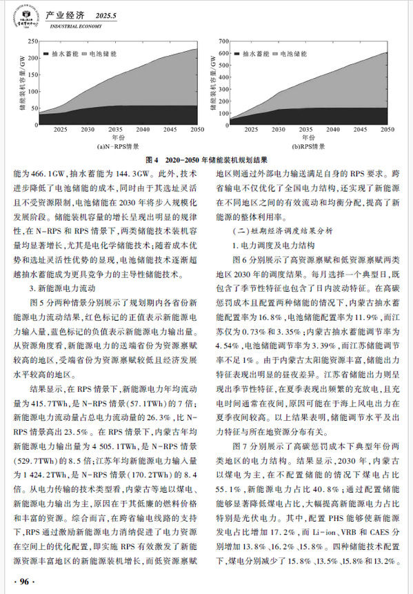 新能源部署对推动能源结构优化和绿色转型具有重要意义,储能技术是保障高比例新能源电力消纳体系建设的关键措施。该文以中国省级电力系统为研究对象,通过小时级容量因子刻画可再生能源的区域异质性,链接省级电力系统扩容模型和区域经济调度模型,揭示多元化储能技术在资源禀赋差异下如何影响新能源电力消纳及电力系统碳排放。研究结果表明:在跨省输电支持下,可再生能源电力消纳责任权重显著刺激了高资源禀赋地区的新能源和储能装机,从而促进新能源电力的空间流动和均衡分配;储能技术能够提升新能源消纳并减少碳排放,相比低资源禀赋地区,储能在高资源禀赋地区的作用更加明显;受技术成本影响,多元化储能技术路线演进趋势不同,中期2030年以抽水蓄能技术为主导,远期2050年以全钒液流等电池储能为主导。文章认为,在进行储能技术部署时应充分考虑区域资源禀赋及技术发展的差异,兼顾储能的应用效果和应用成本。