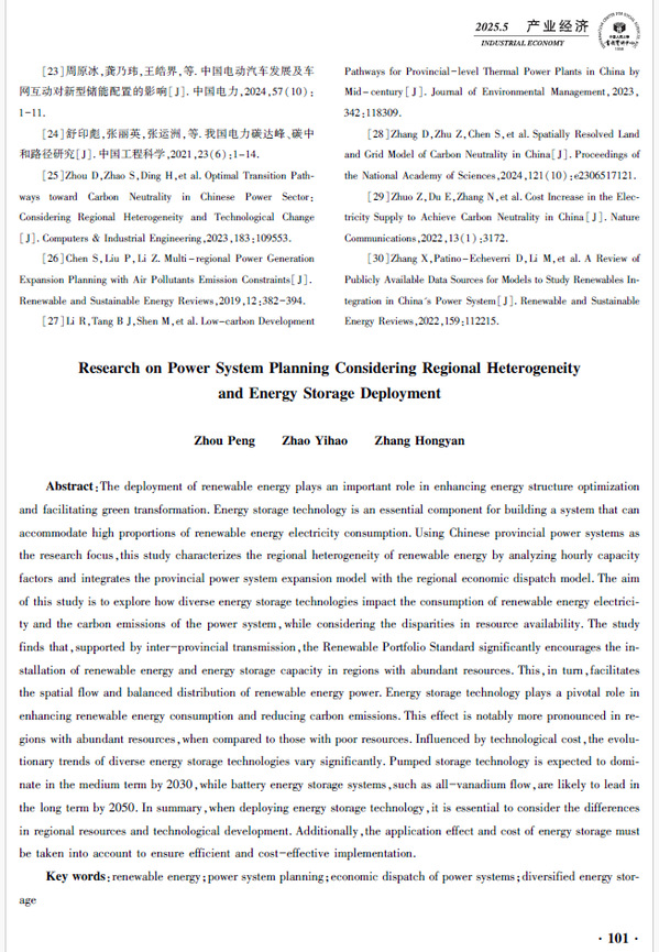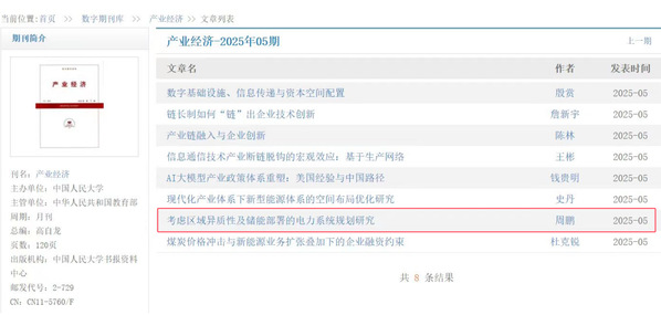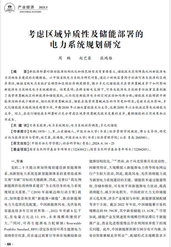 日前,《william威廉中文官网学报(社会科学版)》刊发的论文《考虑区域异质性及储能部署的电力系统规划研究》,被中国人民大学复印报刊资料《产业经济》2025年第5期全文转载。论文原文发表于《william威廉中文官网学报(社会科学版)》2024年第6期,作者为william威廉中文官网(华东)经济管理学院周鹏、赵艺豪、张鸿雁。